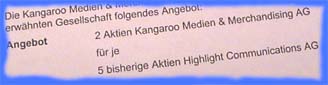 Fotos OnlineReports ![]() ![]() "Fünf gegen zwei": Kangaroo-Umtauschofferte, Highlight-Präsident Bernhard Burgener Dubioses Umtausch-Angebot Unbekannte deutsche Kleinfirma ist scharf auf Aktien der Highlight Communications VON PETER KNECHTLI Ein zweifelhaftes Umtauschangebot unterbreitet die unbekannte deutsche Kleinfirma Kangaroo Medien & Merchandising AG den Aktionären der Highlight Communications AG mit Sitz in Pfäffikon SZ. Der Highlight-Verwaltungsrat warnt die Aktionäre. "Keinen Reim" kann sich der in Pratteln BL residierende Highlight-Verwaltungsratspräsident Bernhard Burgener, einer der Hauptaktionäre von Radio Edelweiss, auf das Umtauschangebot machen, das Ende Juli mit Laufzeit bis 24. August im deutschen Bundesanzeiger veröffentlicht war: Fünf Highlight-Aktien gegen zwei Kangaroo-Aktien. Burgener: "Uns ist das Unternehmen nicht bekannt." Nur 400'000 DMark Umsatz Die Offerte aus Deutschland scheint wenig seriös zu sein. Banken raten offen von einem Umtausch ab. Der Highlight-Verwaltungsrat meldet auf der Website "erhebliche Zweifel an der Seriosität" des Angebots an. Die 1998 gegründete Kangaroo weise letztes Jahr einen Honorarumsatz von gerade mal 400'000 Mark aus - bei einem nicht näher bezifferten Verlust. Auch über die Tätigkeit der Firma ist nichts bekannt. Sicher ist nur, dass die Kangaroo-Aktien an keiner Wertpapierbörse gehandelt werden und für den Inhaber damit wertlos sind. Die Highlight dagegen, am Neuen Markt der Deutschen Börse kotiert, verfügt über liquide Mittel von 130 Millionen Franken. Das Unternehmen ist im Filmlizenzen- und Videogeschäft tätig und vermarktet zudem durch seine Luzerner 80-Prozent-Tochter Team Fussball Marketing AG die UEFA Champions League. Der Gruppenumsatz betrug letztes Jahr 171 Millionen Franken. Der diesjährige Halbjahresumsatz stieg um fast 40 Prozent auf 95 Millionen Franken. Nicht handelbare Aktien verflüssigen Als Motiv vermutet der Verwaltungsrat, "dass mit diesem Tauschangebot nicht handelbare Aktien der Gesellschaft in handelbare und liquide Aktien der Highlight Communications AG umgetauscht werden sollen". Anteilseignern, die das Angebot schon angenommen haben, wird geraten, die Zustimmung gegenüber der depotführenden Bank umgehend schriftlich zu widerrufen. Der Highlight-Kurs liegt zwar mit weniger als drei Euro im Keller, aber die Aktien sind immerhin handelbar. Grund für die Baisse ist die derzeit allgemeine Flaute am neuen Markt. Überdies hat die UEFA den Vermarktungsvertrag per Ende Juni 2003 gekündigt, um den Auftrag neu auszuschreiben. Die Team AG will sich um den lukrativen Auftrag auch bewerben. Burgener setzt auf den bisherigen Leistungsausweis und die Unabhängigkeit: "Wir sind überzeugt, dass wir als Sieger aus diesem Match hervorgehen." 13. August 2001 |