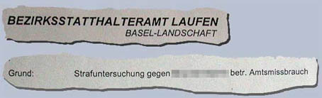 © Ausriss OnlineReports ![]() "Ich habe die Aufsicht über das Verfahren": Schwiegersohn trumpfte auf Dugginger Lohnaffäre: Verfahren jetzt auch gegen Vögtlins Schwiegersohn Der als Polizei-Fahnder tätige Schwiegersohn des Gemeindepräsidenten gab sich als "Verfahrens-Aufseher" aus VON PETER KNECHTLI Die Affäre um den angeblich frisierten Lohnausweis des Gemeindepräsidenten von Duggingen BL weitet sich aus: Jetzt hat das Statthalteramt Laufen auch gegen dessen Schwiegersohn eine Strafuntersuchung wegen Amtsmissbrauch eingeleitet. Pikant: Der Angeschuldigte ist Fahnder bei der Baselbieter Kantonspolizei. Er soll sich als Verfahrensleiter ausgegeben haben. Kurz vor den Sommerferien platzte die Bombe durch ein Communiqué der Laufener Untersuchungsrichterin Jacqueline Vogel: Gegen Reinhard Vögtlin, den Gemeindepräsidenten, und Urs Schönenberger, den Gemeindeverwalter von Duggingen, läuft eine Strafuntersuchung. Mögliche Tatbestände: Amtsmissbrauch, versuchte Anstiftung zur Urkundenfälschung im Amt, Begünstigung und Urkundenunterdrückung. Bei einer