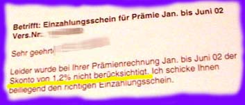 Matthys ist kein Einzelfall. Helsana-Sprecher Christian Beusch, der erst durch die Anfrage von OnlineReports von der Panne erfuhr, bestätigte die Fehlrechnungen. Beusch sprach von "gut einem Dutzend Mitglieder, die reklamiert oder den Skonto einfach von sich aus abgezogen haben". Es werde jetzt abgeklärt, "warum das passiert ist". Beusch: "Derzeit läuft ein Programm durch alle Rechnungen hindurch, damit wir die falschen heraus filtern können." Britts Intervention hatte offenbar keine Folgen Dass in der Helsana-Administration nicht alles zum Besten steht, dokumentierte Mitte letzten Jahres schon der "Beobachter": Der Marktleader leiste sich "peinliche Fehler mit Prämien, Policen oder Abrechnungen". Fritz Britt, Vizedirektor im Bundesamt für Sozialversicherung, kündigte damals an, er wolle bei der Helsana "vorstellig werden und Auskunft verlangen". Viel scheint sich seither nicht gebessert zu haben: Bevor Kunde Matthys die fehlerhafte Halbjahresrechnung erhielt, schickte ihm Helsana eine "Leistungsabrechnung" über mehr als sechshundert Franken für den Besuch bei einem Aargauer Arzt zu, den er weder kannte noch je aufgesucht hatte. Dafür scheint Helsana Meister zu sein, wenn es um den Versand von Papier geht. Die Prämienrechnungen sind nicht nur voll Abkürzungen jeder Art, sie sind auch wenig kundenfreundlich gestaltet: Nach der Versichertennummer, die im Falle von Nachfragen beim Kundendienst als Erstes erfragt wird, muss bei Familienabrechnungen regelrecht gefahndet werden. Dagegen findet sich im Tabellenkopf die Rubrik "Partnerkonto", die für den Versicherten praktisch von geringer Bedeutung ist. Vorschlag für eine "gesunde Idee" (Helsana-Werbeslogan): Die Frage des Papierverkehr bezüglich Flut und darstellung kritisch und aus der Optik des Prämienzahlers zu überprüfen. 20. Januar 2002 |