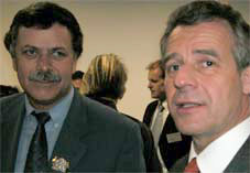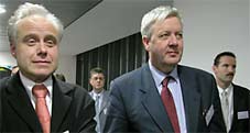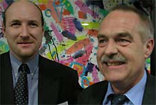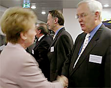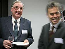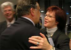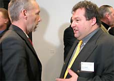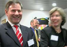 LIESTAL. - Rund 300 Gäste aus Gewerbe, Wirtschaft, Politik und Bildung trafen sich am Mittwochabend in Liestal auf Einladung der Wirtschaftskammer Baselland in den Gemäuern der Basellandschaftlichen Kantonalbank zum Neujahrs-Apéro. Präsident Andreas Schneider, Direktor Hans Rudolf Gysin (Foto, im Smalltalk mit Regierungspräsidentin Elsbeth Schneider) und BLKB-Chef Paul Nyffeler hiessen die Gäste willkommen. Präsident Schneider ging in seiner Ansprache unter anderem auf die Stärkung des grenzüberschreitenden Beratungsnetzes für KMU ein. Zudem forderte er, dass in der Nordwestschweiz tätige ausländische Anbieter bezüglich Sozialpartnerschaft "mit den gleichen Wettbewerbs-Spiessen kämpfen müssen wie unsere eigenen Unternehmen". Als Höhepunkt des bevorstehenden Jahres nannte Schneider die vierte Berufsschau, die vom 22. bis 26. Oktober stattfindet. Mut und Zuversicht vertrömte der Redner mit einem (Wilhelm) Busch-Zitat: "Des Schweines Ende ist der Wurst Anfang." (8. Januar 2003)