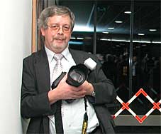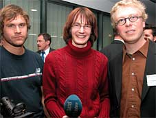 Der Story auf der Spur: TeleBasel-Reporterin Mirjam Jauslin (Mitte), neuer Basler SF DRS-Korrespondent Simon Erny (rechts) |