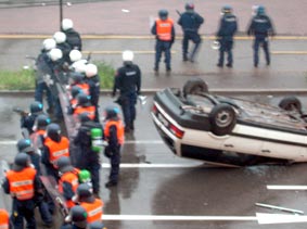 In schweren Tumulten artete am Samstagabend das für die Schweizer Fussball-Meisterschaft entscheidende Spiel FC Basel gegen den FC Zürich im Basler St. Jakobspark aus: Nachdem der FC Zürich in der Nachspielzeit das Siegestor zum 1:2 schoss, kam es erst auf dem Spielfeld und später vor dem Stadion zu stundenlangen Tumulten, die zu mehreren Verletzten und zahlreichen Verhafteten führten. Die Polizei setzte Tränengas, Gummigeschosse und Wasserwerfer ein.