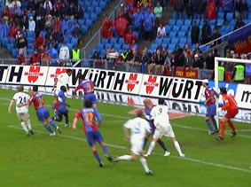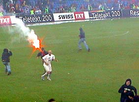 Dazu kommt die Beschimpfung der Gegner: "FCZ-Hurensöhne!" Woher will das die "Muttenzerkurve" eigentlich wissen? Was ist mit den weiblichen FCZ-Fans? Auch das liegt offenbar im Bereich des Tolerierten - Reaktionen auf frühere Beschimpfungen gab es von offizieller Seite keine nennenswerten. Das Auspfeifen des Gegners ist zum festen Bestandteil eines jeden Matchs geworden. Der nächste Schritt ist das Bewerfen der gegnerischen Fans oder unliebsamen Spieler der Gegenmannschaft mit Gegenständen. Hakan Yakin hat die Plastikbecher und die Bierdusche ja überlebt, wird hier wohl die Entschuldigung sein. Mit den Petarden, Leuchtraketen und anderem Feuerwerk folgt der nächste Schritt der Eskalation, wobei mit zunehmender Spannung die Schussbahn flacher wird.