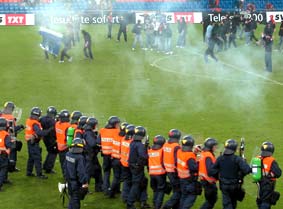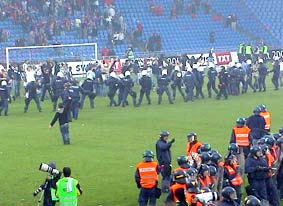 Ohne von Ordnungskräften daran gehindert zu werden, versuchten erste Spielfeld-Stürmer in die gegenüberliegende Ecke der Zürcher Fans zu gelangen. Einige der Aggresseure hatten es aber auch auf Spieler abgesehen. So sah OnlineReports, wie mehrere Basler Fans den entscheidenden Torschützen Filipescu tätlich angriffen, wobei dieser mit Fusstritten entschlossen zurückgab. Die Szenen erinnerten an den bedenklichen Match der Schweiz gegen die Türkei am 16. November 2005 in Istanbul. Nach einigen Augenblicken traten massive Polizeikräfte in Kampfmontur auf das Spielfeld und bildeten einen Kordon, um ein massenhaftes Vorrücken der Basler "Fans" gegen die "Zürcher Ecke" zu verhindern. Dabei wurde die Polizei mit Gegenständen verschiedener Art beworfen, während - groteskes Bild - in der "Zürcher Ecke" Fans und Spieler tanzten und jubelten. Die Polizei setzte Gummigeschosse und Kampf-Sprays ein.