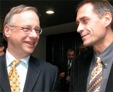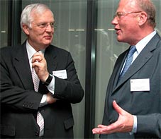 "Du bist ja gar nicht so rechts ..." - "... und Du gar nicht so links": Handelskammer-Direktor und Basler Grosssratspräsident, Andreas Burckhardt (lib.), neuer Wirtschaftsförderer Hans-Peter Wessels (SP). |