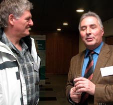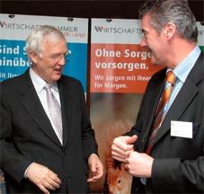"Habt Ihr wieder eine heisse Story über mich?": Wirtschaftskammer-Präsident Andreas Schneider (nach Referat), TeleBasel-Chef Willy Surbeck. |