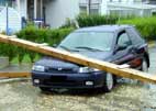 SISSACH. - Ein Selbstunfall mit massivem Schaden ereignete sich heute Sonntag um 4.35 Uhr auf der Gelterkinderstrasse in Sissach. Der Fahrer eines Personenwagens fuhr von Sissach her kommend auf der Gelterkinderstrasse in Richtung Böckten. In der Linkskurve vor dem Polizei-Stützpunkt Sissach überfuhr der Wagen das rechte Trottoir und kollidierte zuerst mit einem Baum, der geknickt wurde, und anschliessend mit einem parkierten Auto. Nach der Kollision mit einen weiteren Baum kam der Wagen wieder auf der rechten Fahrspur der Gelterkinderstrasse zum Stillstand. Dort geriet er in Brand, das durch die Feuerwehr gelöscht wurde. Nach einem Atemlufttest, der 0.95 Promille, ergab, musste sich der Fahrzeuglenker einer Blutprobenentnahme unterziehen und seinen Führerausweis auf der Stelle abgeben. (1. August 2004)