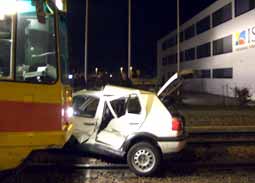 REINACH. - Bei einer Frontalkollision zwischen einem Personenwagen und einem Tram der Linie 11 in Reinach wurden gestern Donnerstagabend gegen 21.45 Uhr fünf Personen verletzt. Der 41-jährige Lenker des Personenwagens beabsichtigte, von der Sundgauerstrasse kommend via Baselstrasse Richtung Fleischbachstrasse zu fahren. Zunächst hielt er bei der Lichtsignalanlage der Kreuzung Sundgauerstrasse / Baselstrasse an. Fuhr jedoch - noch während die Ampelphase für ihn auf Rot stand - aus bisher unbekannten Gründen wieder an und kollidierte frontal mit dem auf der Baselstrasse, geradeaus Richtung Basel fahrenden Tram der Linie 11. Durch die Wucht des Aufpralls wurde das mit dem Tram verkeilte Auto noch rund 20 Meter Richtung Basel mitgezogen. Sämtliche fünf Insassen des Personenwagens, davon zwei Kinder im Alter von 10 und 15 Jahren, wurden bei diesem Unfall verletzt. An beiden Fahrzeugen entstand ein Sachschaden von mehreren zehntausend Franken. (29. Dezember 2006)