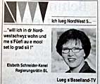 Dieses Bild gefällt uns. Es ist authentisch. Zeigt Elsbeth Schneider, wie sie ist: Sendungsbewusst, stringent, eine pikante Prise aus Charme, Romantik und Entschlossenheit. Letzteres deuten die leicht nach unten geneigten Mundwinkel an. Die Augen leicht zugeniffen nach dem Motto: So, drück endlich ab! Vor allem aber - und das ist das Entscheidende: Das total neue Outfit. Das Haar kürzer und kecker, die Brille randlos statt horngefasst. Redesign, wie oft nach Statusüberprüfung üblich. Zeichnet sich da ein Karrieresprung ab? War nur eine Frage. Wir werden jedenfalls wunschgemäss nur noch dieses Bild publizieren - sofern uns nicht ein eigenes besser gefällt. Ans Vernichten denken wir jedenfalls nicht. Und fürs Staatsarchiv ist Elsbeth Schneider noch zu jung.